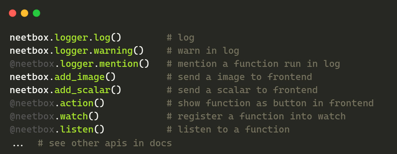Neetbox provides functions and function decorators for python codes. Neetbox python APIs are designed for easy purpose, they automatically connects your projects and web.